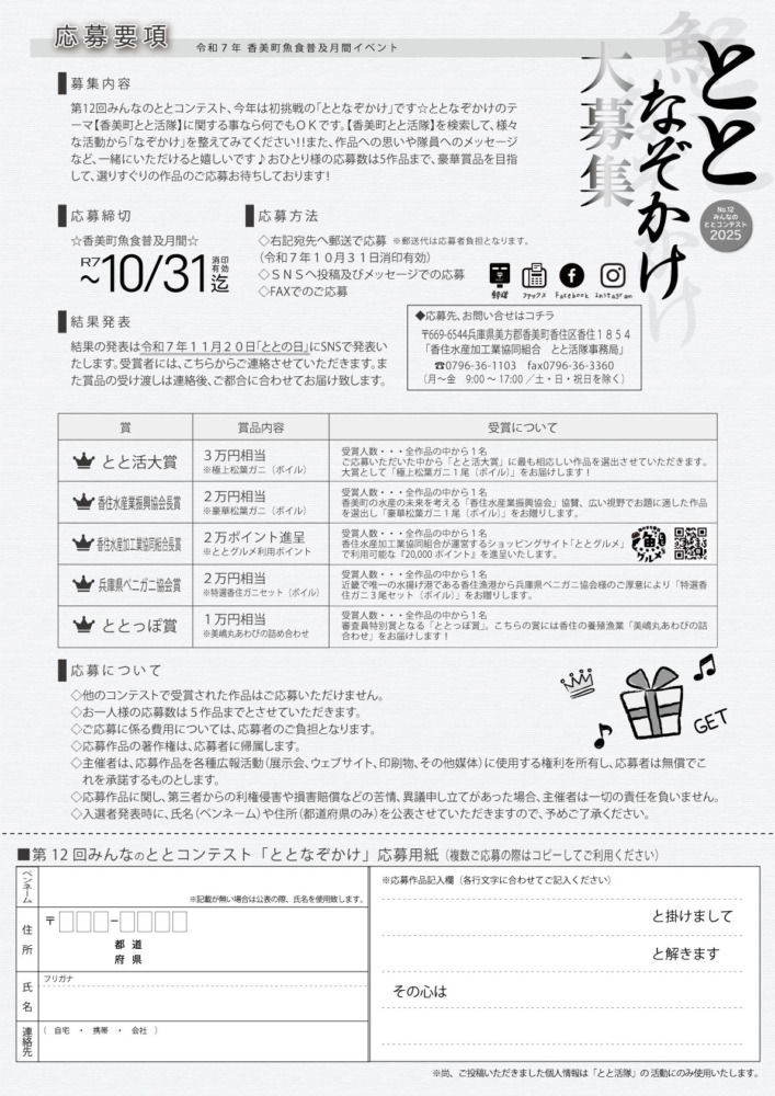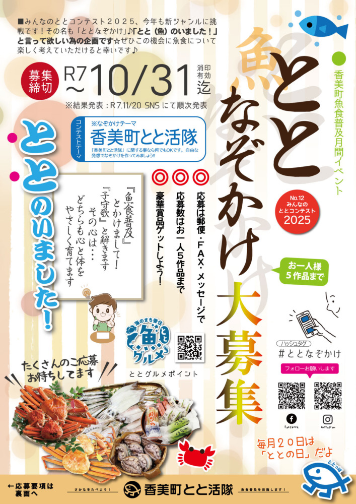 香美町とと活隊はおかげさまで昨年10周年を迎えており、今まで料理教室や講話、オリジナルアトラクションなど様々な活動をして参りました。今回のなぞかけでは「香美町とと活隊」から連想し、活動の趣旨や魚食の大切さが少しでも多くの方へ伝わることを願った企画です。