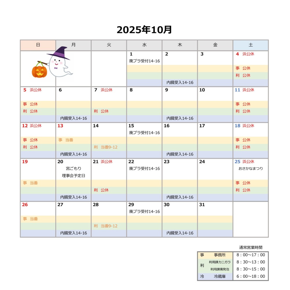 Information HOMEお知らせスケジュール2025年10月の営業日を更新しました スケジュール 2025年10月の営業日を更新しました 2025.09.30 2025年10月の営業日カレンダーです。事業所によって営業日が異なりますのでご注意ください。※カニガラ引取は利用課をご覧ください※10月8日の廃プラスチック受付はおやすみします
