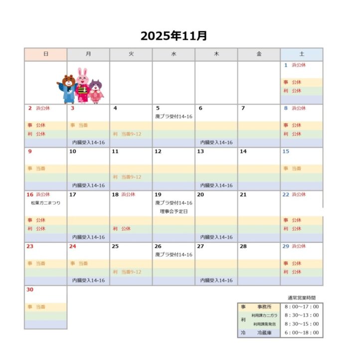 Information HOMEお知らせスケジュール2025年11月の営業日を更新しました スケジュール 2025年11月の営業日を更新しました 2025.11.01 2025年11月の営業日カレンダーです。事業所によって営業日が異なりますのでご注意ください。※カニガラ引取は利用課をご覧ください※11月12日の廃プラスチック受付はおやすみします