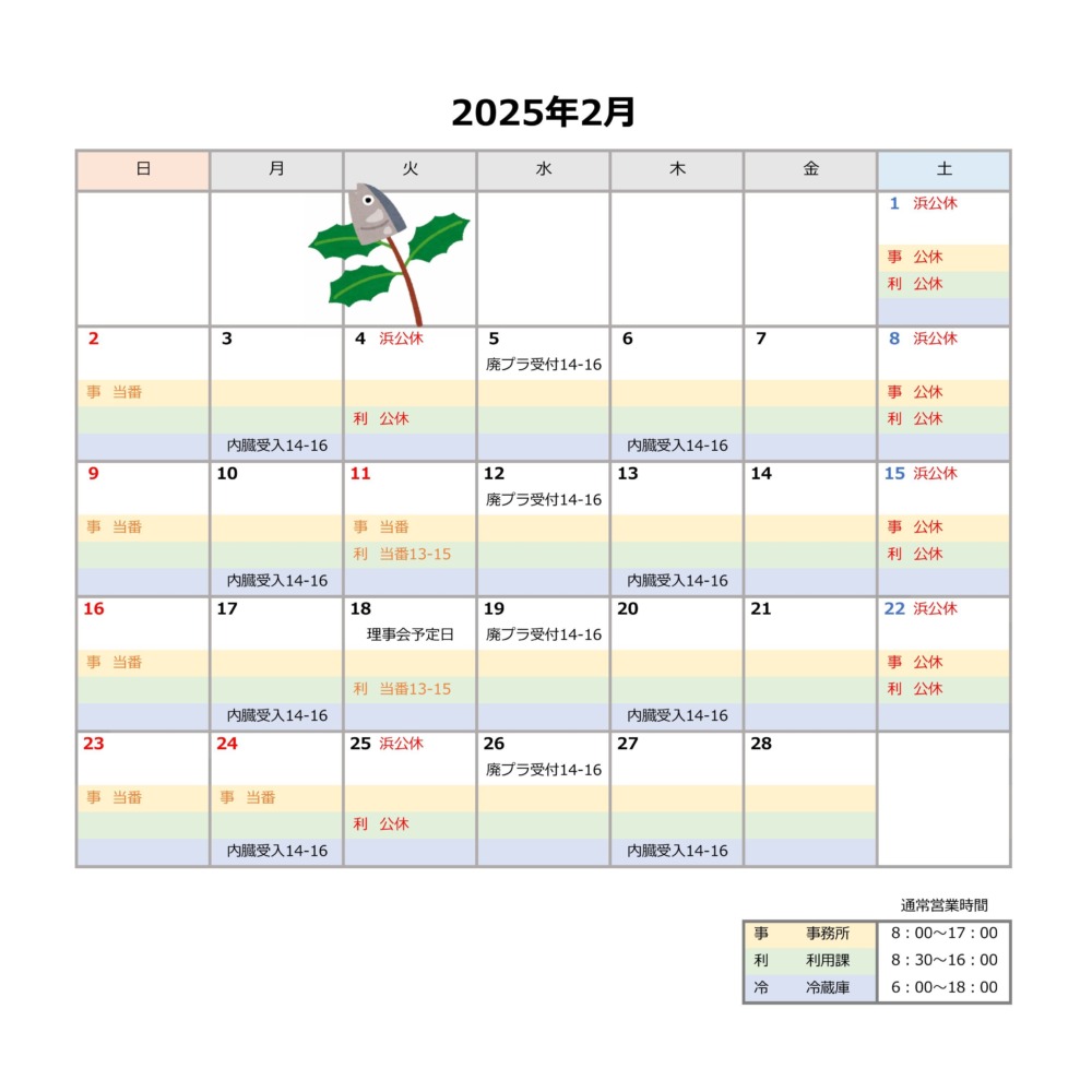 Information HOMEお知らせスケジュール2025年2月の営業日を更新しました スケジュール 2025年2月の営業日を更新しました 2025.02.03 2025年2月の営業日カレンダーです。事業所によって営業日が異なりますのでご注意ください。※カニガラ引取は利用課をご覧ください