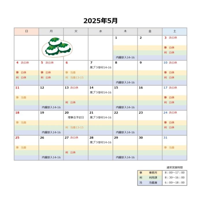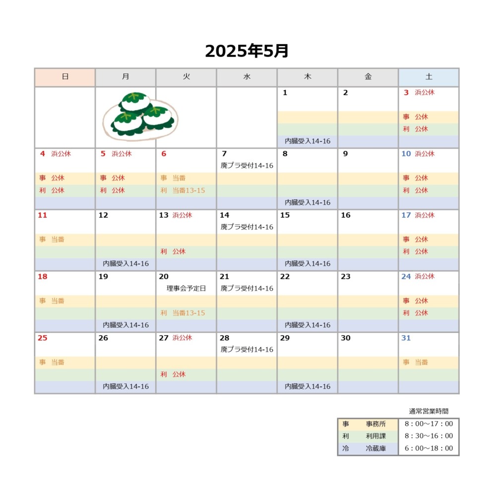 Information HOMEお知らせスケジュール2025年5月の営業日を更新しました スケジュール 2025年5月の営業日を更新しました 2025.05.01 2025年5月の営業日カレンダーです。事業所によって営業日が異なりますのでご注意ください。※カニガラ引取は利用課をご覧ください