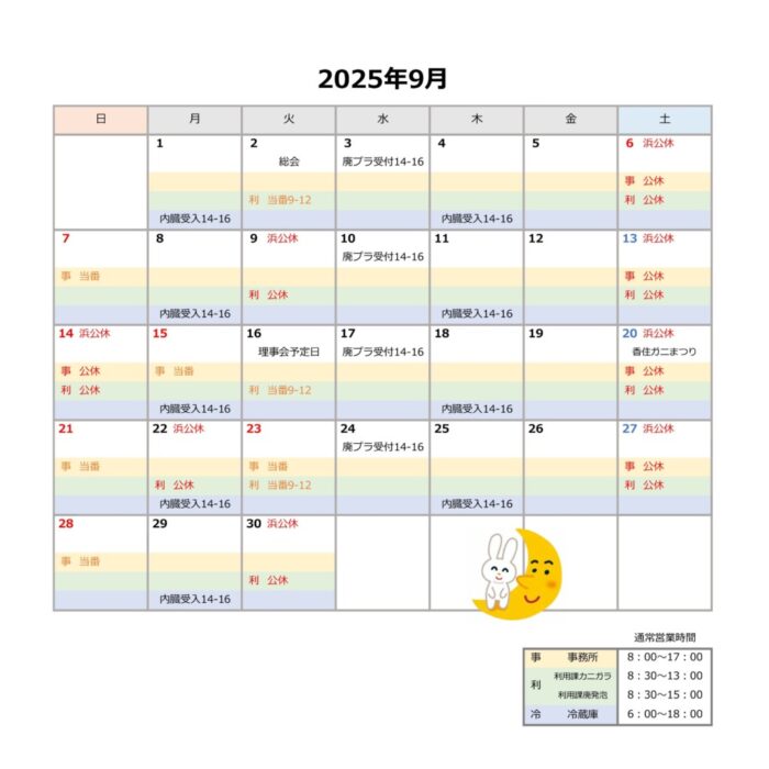 Information HOMEお知らせスケジュール2025年9月の営業日を更新しました スケジュール 2025年9月の営業日を更新しました 2025.09.05 2025年9月の営業日カレンダーです。事業所によって営業日が異なりますのでご注意ください。※カニガラ引取は利用課をご覧ください